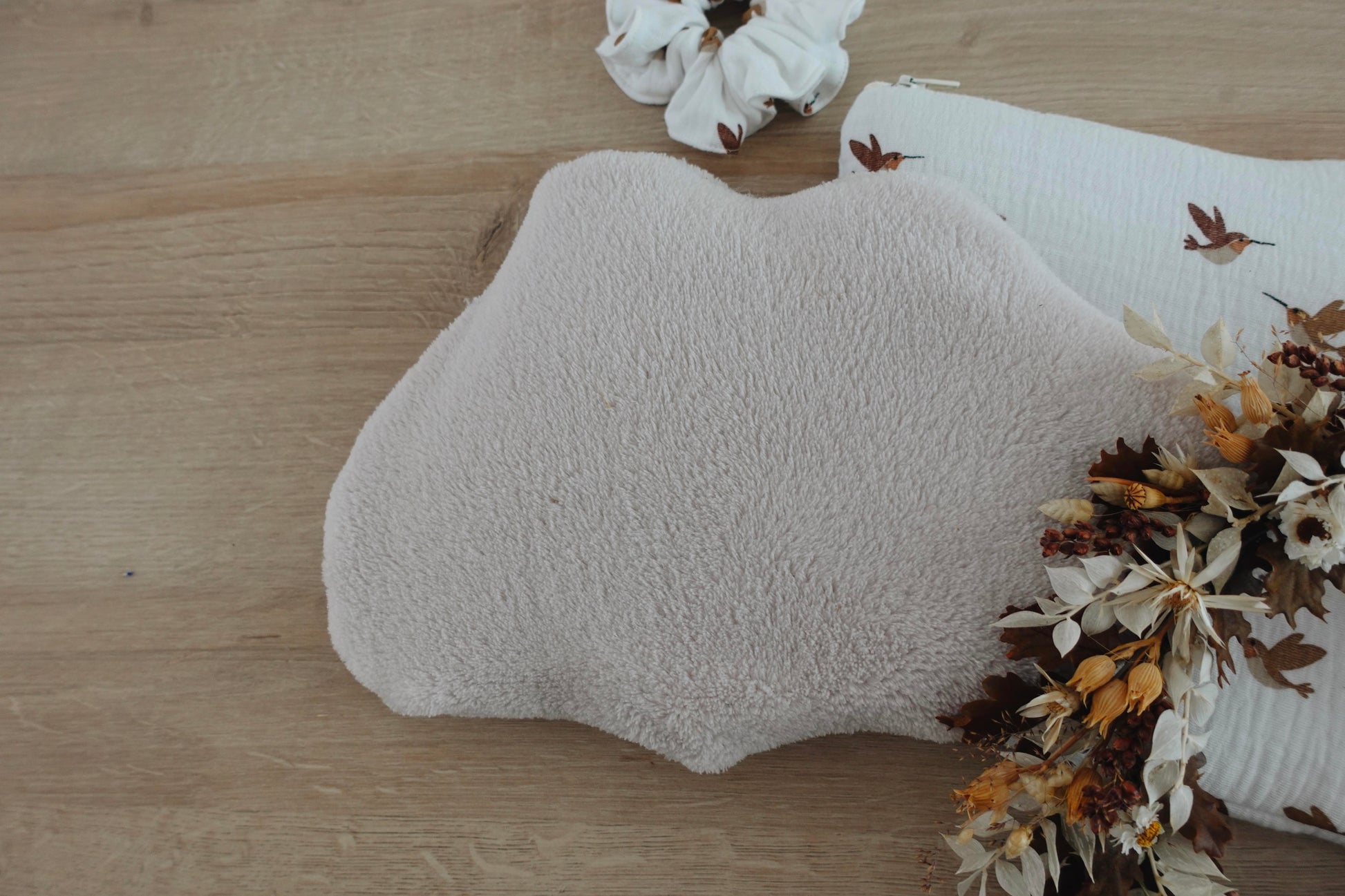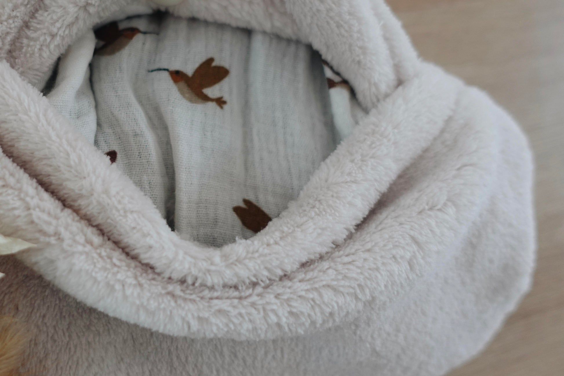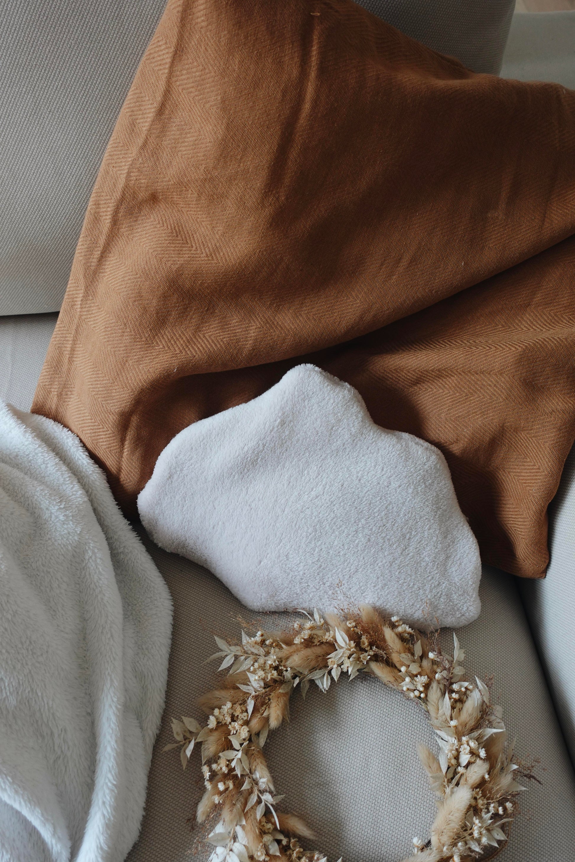 Notre bouillotte Nuage est composée d'une housse extérieure en moumoute ou en velours selon les modèles, et d'une housse intérieure en jolie gaze de coton à motifs.