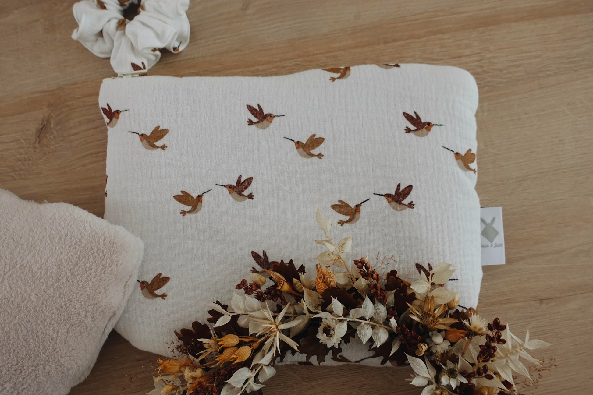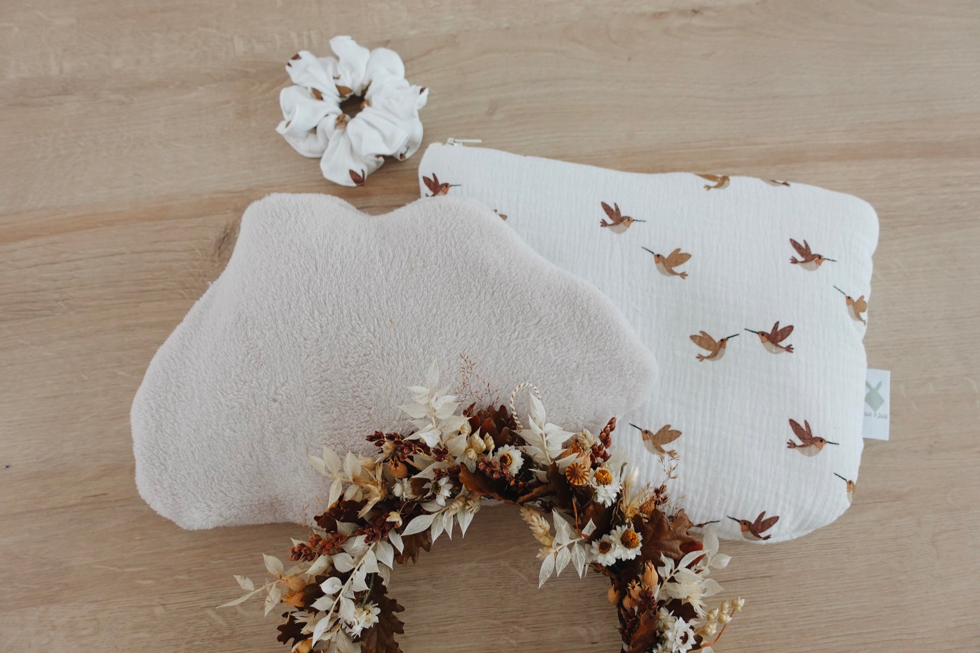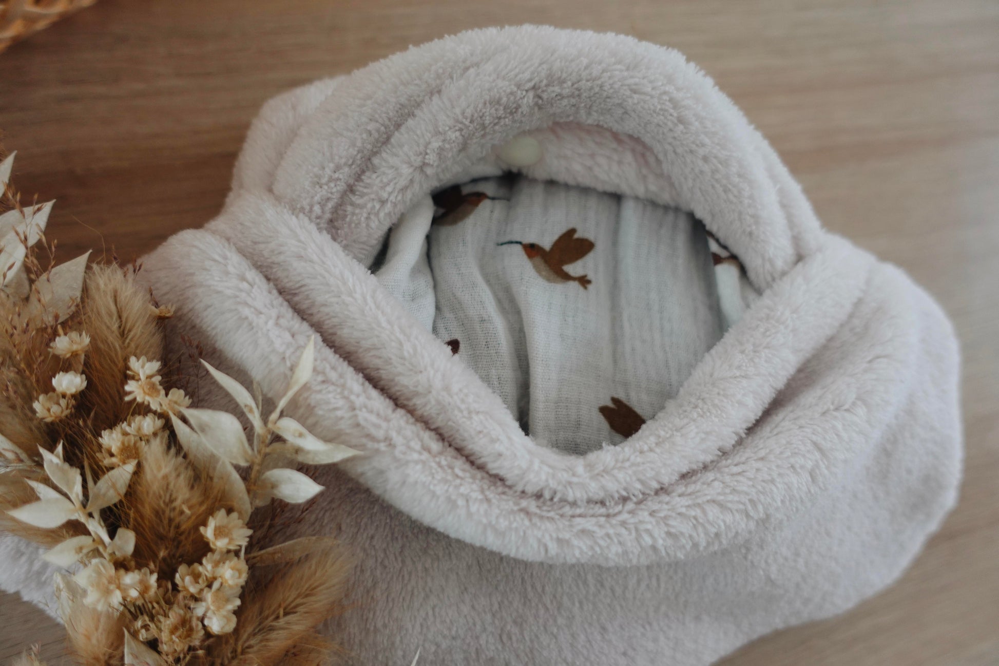 Notre bouillotte Nuage est composée d'une housse extérieure en moumoute ou en velours selon les modèles, et d'une housse intérieure en jolie gaze de coton à motifs.